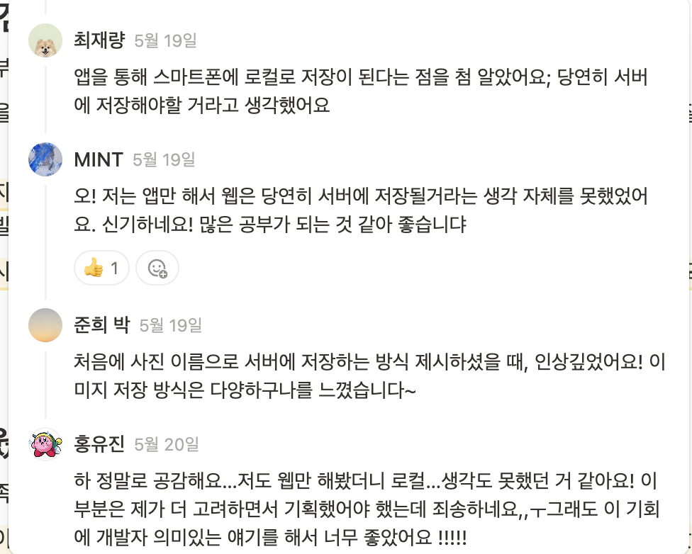 이렇게 가볍게 댓글을 주고받으며, 서로의 생각을 자연스럽게 공유할 수 있었다.